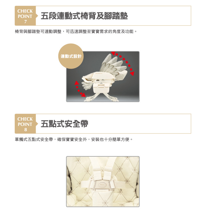 五段式連動椅背及腳踏墊角度調整