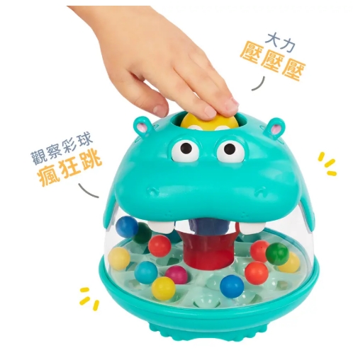 邊玩邊疑問,多壓幾下找解答!學習數數,辨識顏色,建立因果觀念,了解遊戲構造原理。想挑戰難一點的嗎?用手搖晃河馬身體,讓每顆彩球都滾進洞裡。心情捲成一團毛線的時候,更要盡情大力按,釋放焦慮安撫情緒,媽咪爸比也多按幾下吧!